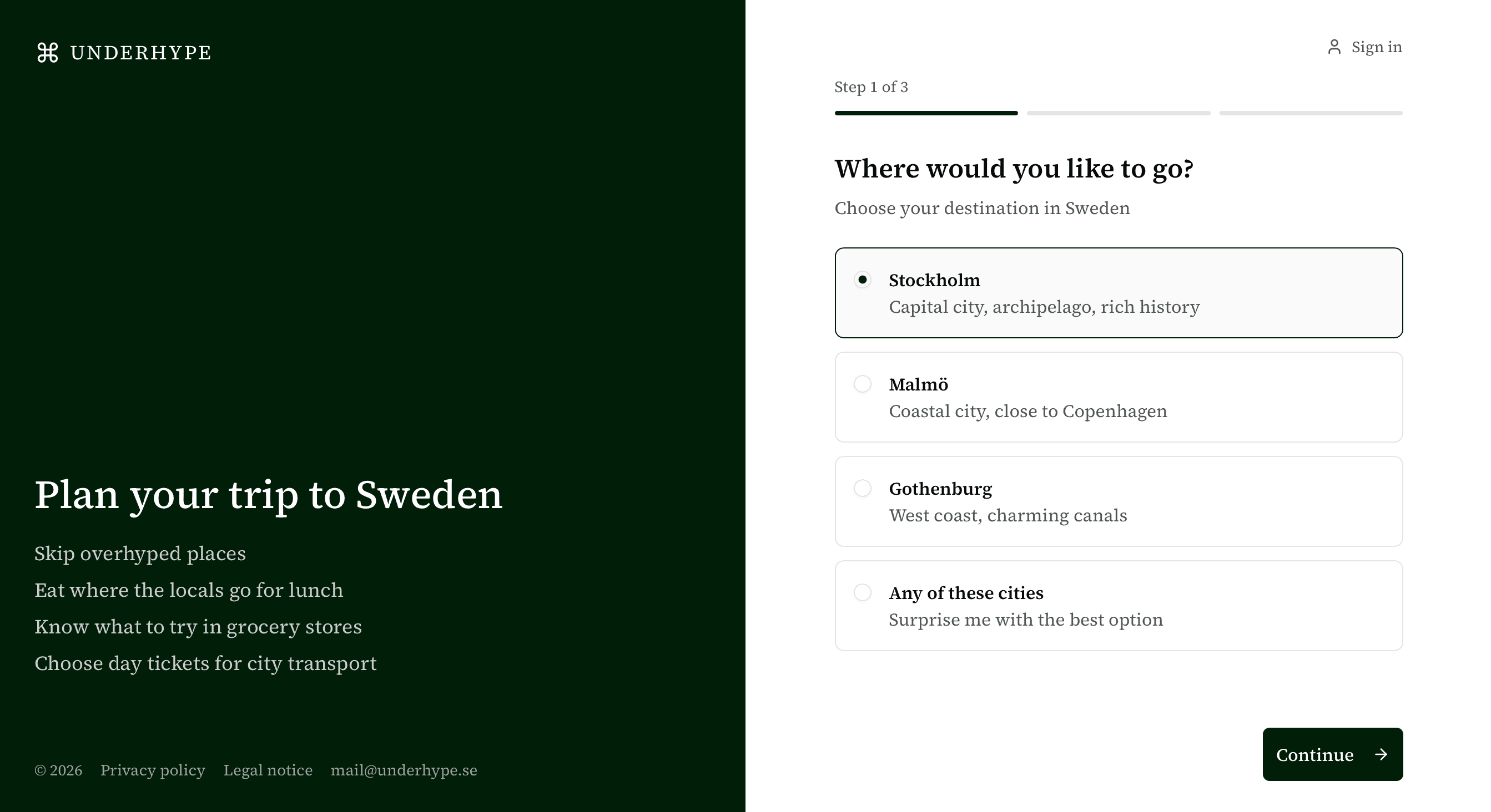Underhype cuts the noise. It focuses strictly on Sweden and relies on strong editorial reviews, giving you recommendations based exactly on your schedule and trip length.